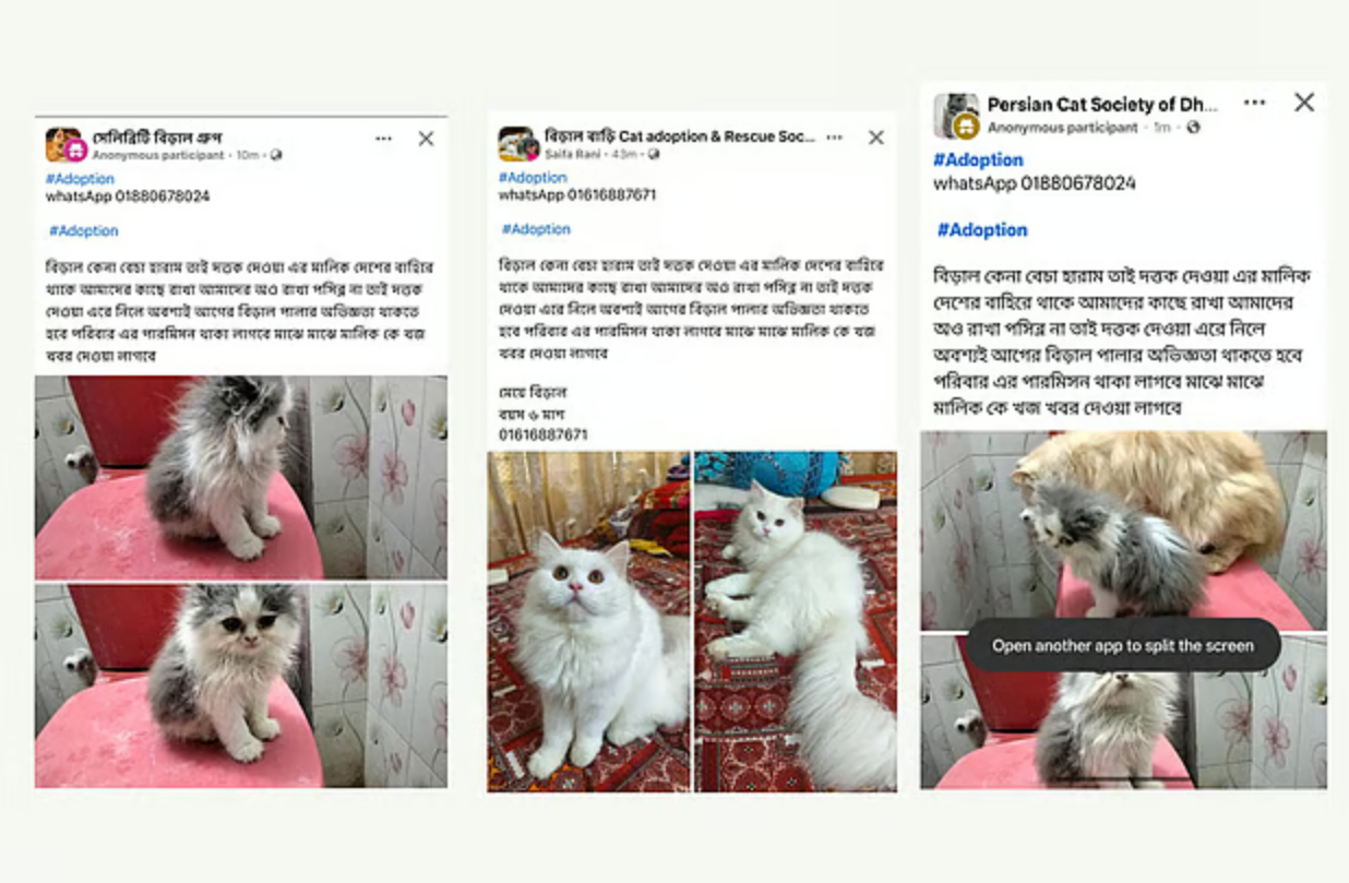 ফেসবুকে পারসিয়ান বিড়াল দত্তক দেওয়ার এমন প্রলোভনে প্রতারিত হচ্ছেন অনেক।ছবি: কোলাজ